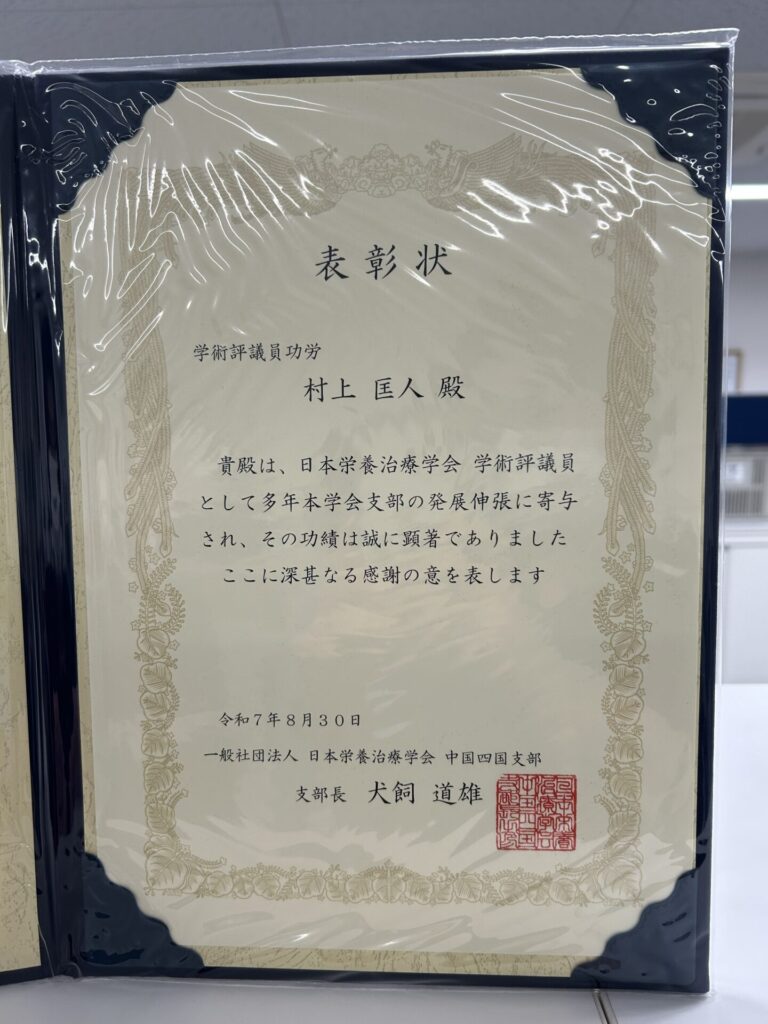 当院の院長が、日本栄養治療学会 中国四国支部より「学術評議員功労表彰」を受賞いたしました。