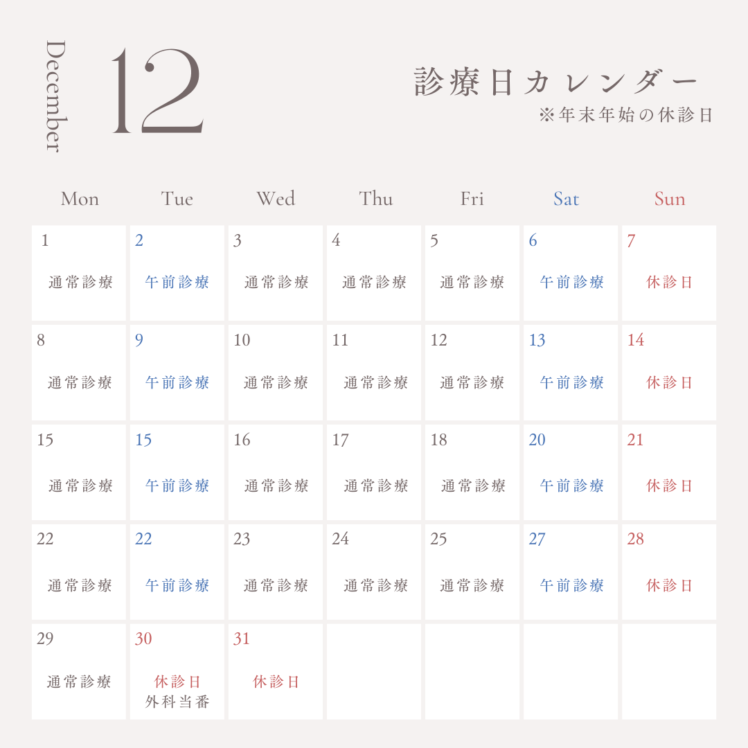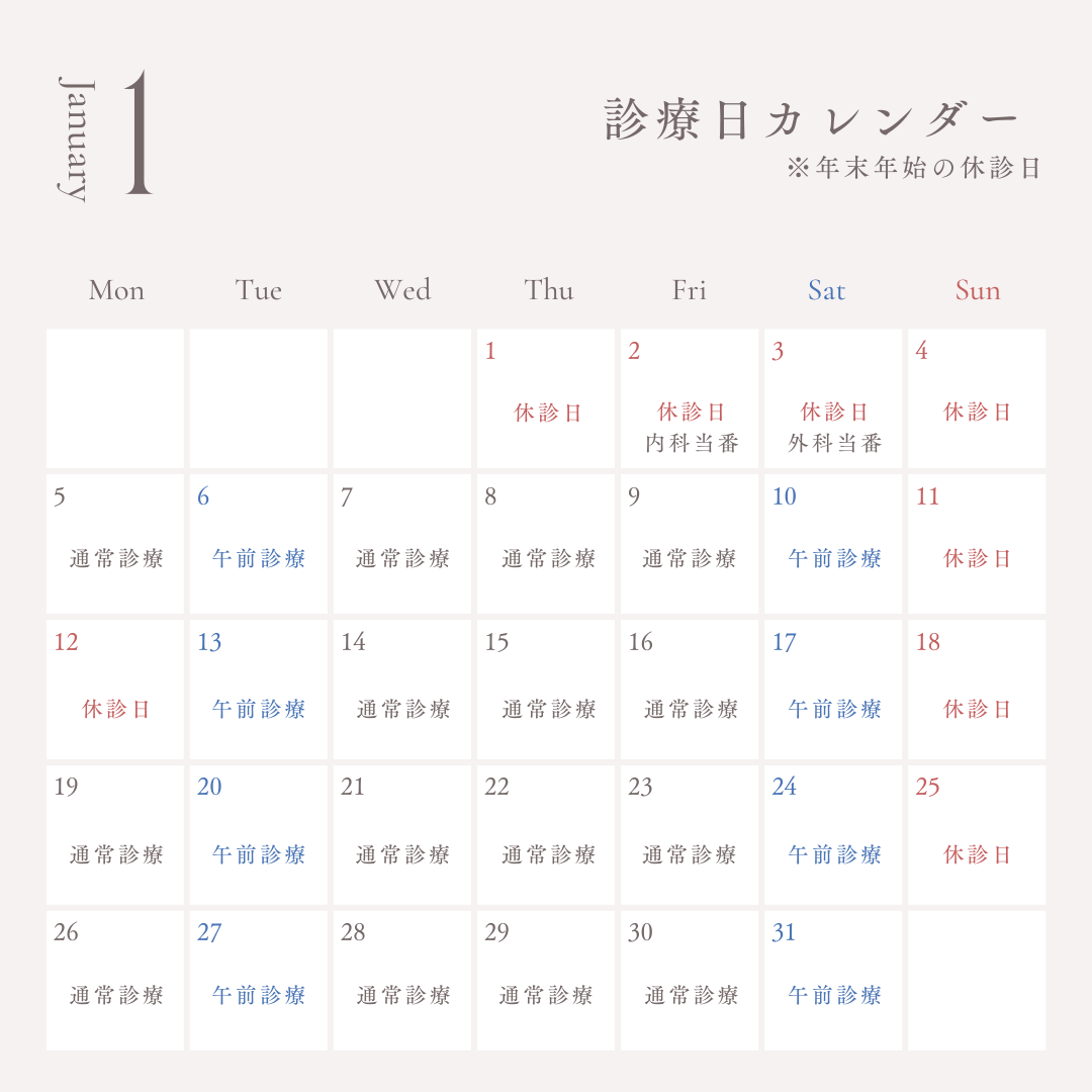 📌 12月30日(火) 休診(外科当番)📌 12月31日(水) 休診📌 1月1日(木) 休診📌 1月2日(金) 休診(内科当番)📌 1月3日(土) 休診(外科当番)📌 1月4日(日) 休診