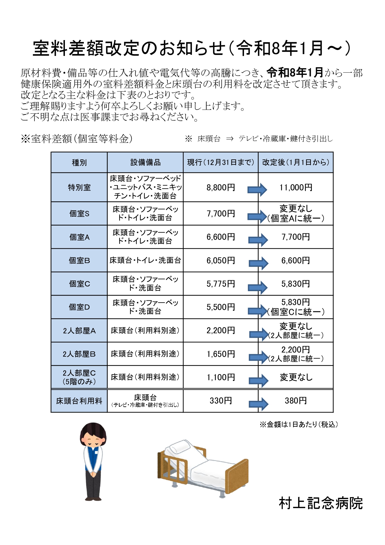 令和8年1月より、一部の健康保険適用外となる室料差額料金および床頭台利用料を改定いたします。