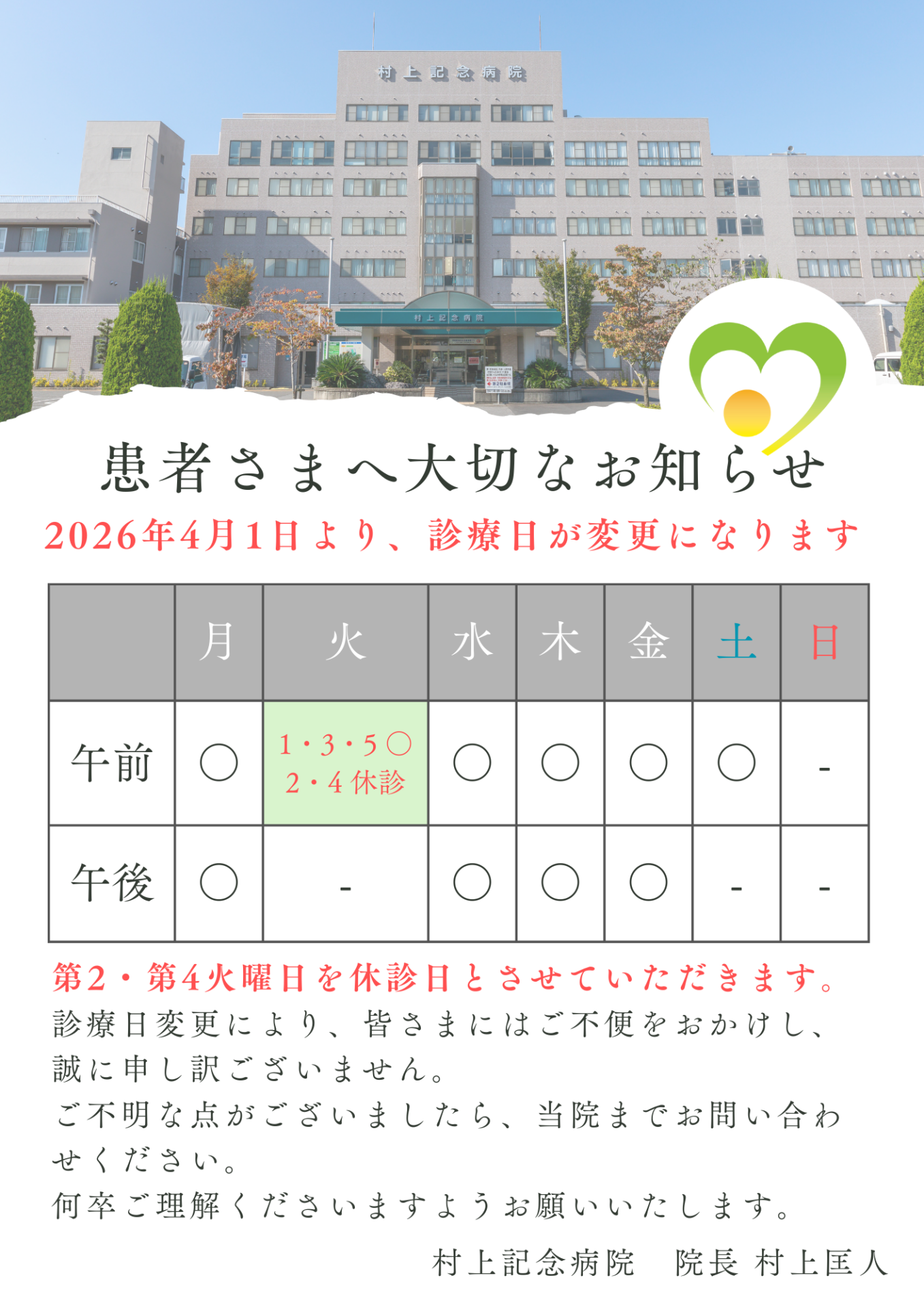 診療日変更により、皆さまにはご不便をおかけいたしますが、何卒ご理解とご協力のほどお願い申し上げます。