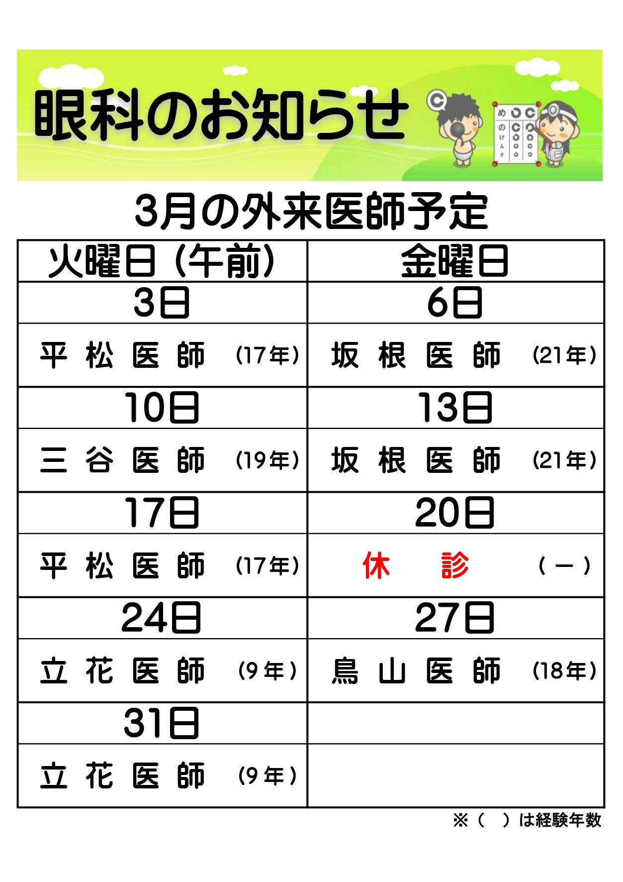※科目によって診療日時が異なります。 休診情報はこちらからご確認ください。