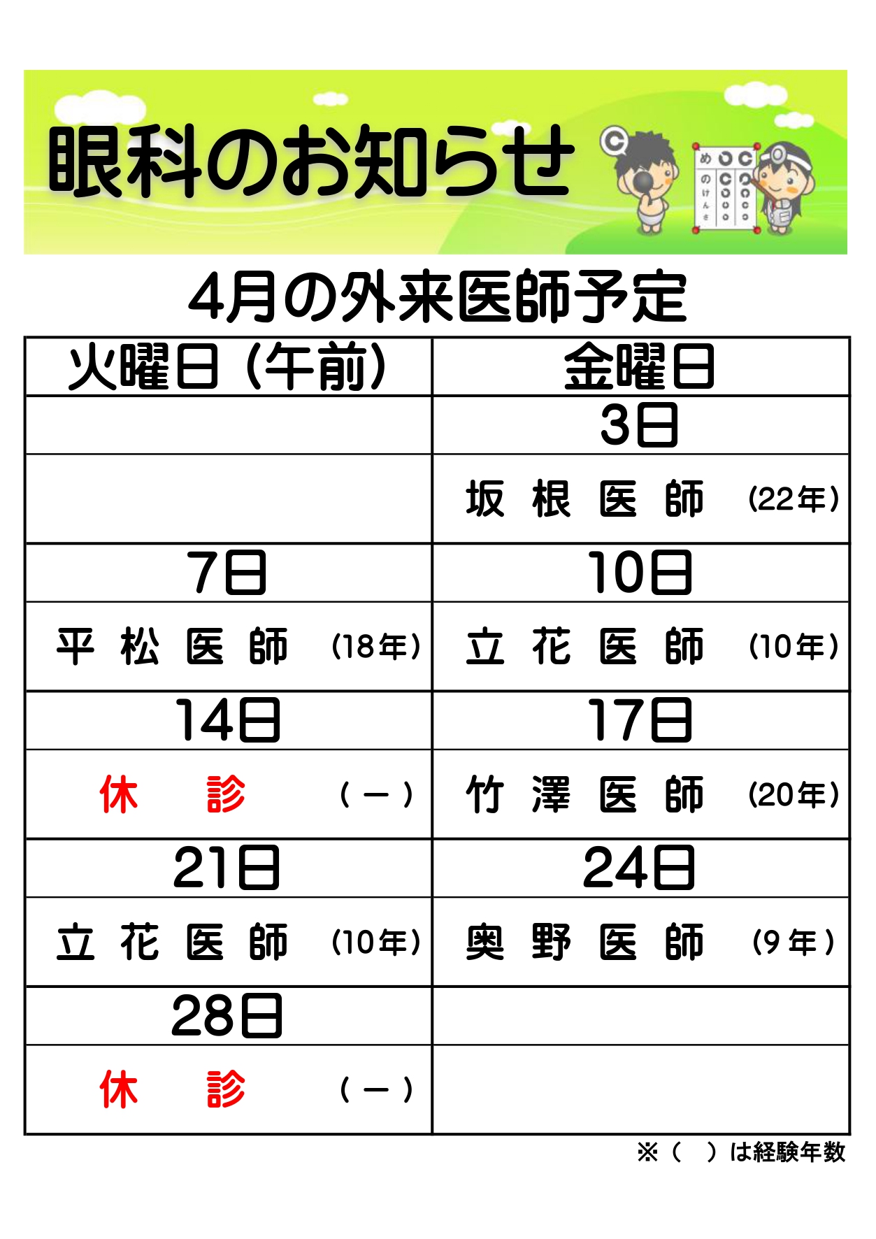 ※科目によって診療日時が異なります。 休診情報はこちらからご確認ください。